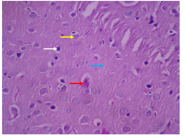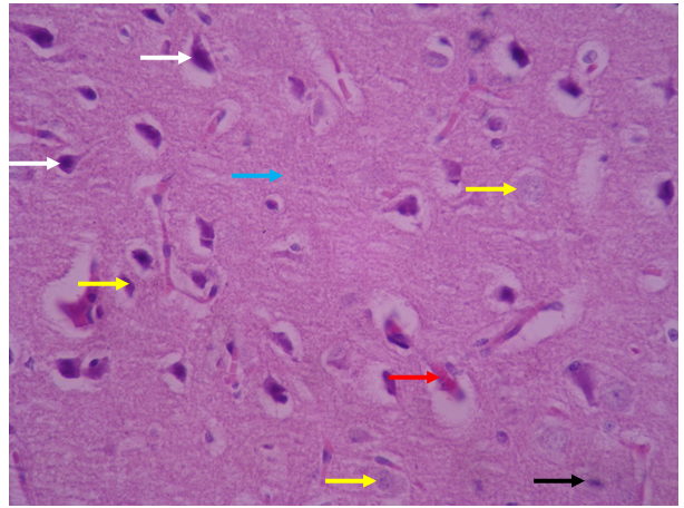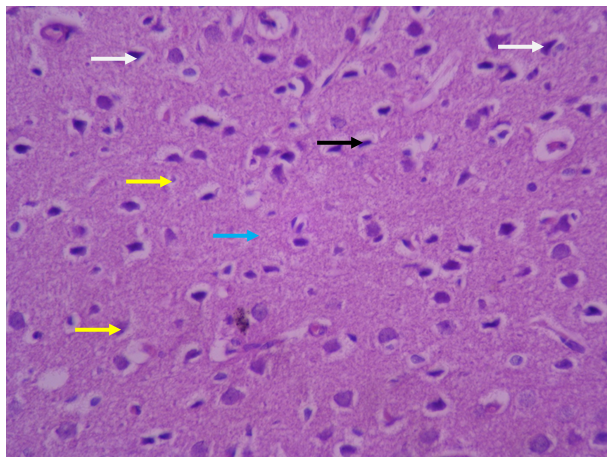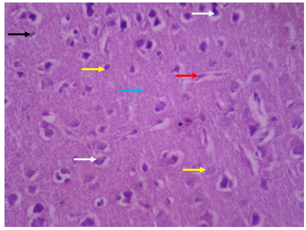 Gray matter and its surface layer, called the molecular layer, have fewer cells and more nerve fibers, and its characteristics are quite normal. The various layers in gray matter zone are regular and with a normal number of cells. The characteristics of pyramidal neurons (white arrow) and neuroglycemic cells (yellow arrow) are completely normal and their nucleus and cytoplasm have a natural form and appearance. Microglia cells with dark and elongated nuclei are seen with appropriate dispersion and number (black arrow). Blood vessels and the structure of the blood-brain barrier (red arrow) are visible with a natural appearance. The neuropilezone is also seen with normal characteristics (blue arrow).