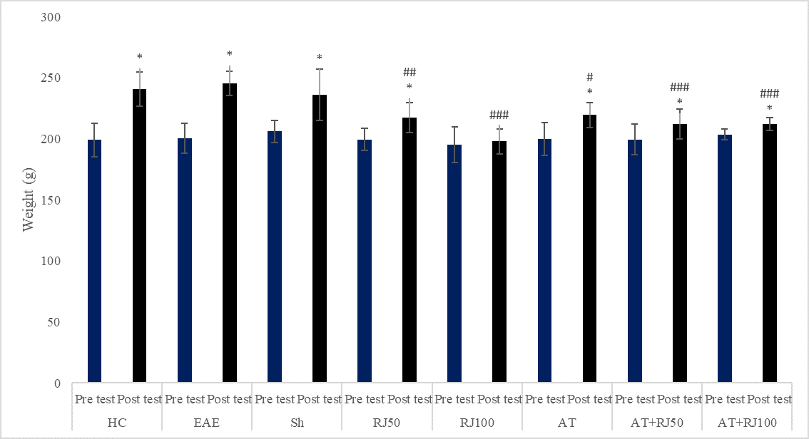 The results of Bonferroni’s post hoc test showed that there was no significant difference in the post-test weight levels of the HC and EAE groups (P = 0.99); there was also no significant difference in the post-test weight levels of the Sh group compared to the EAE group (P = 0.99). Post-test weight levels in the RJ100 (P = 0.001), AT + RJ50 (P = 0.031) and AT + RJ100 (P = 0.029) groups were significantly lower than the Sh group