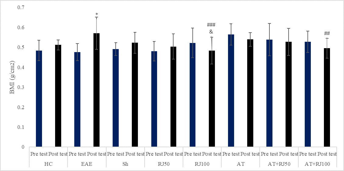 (Figure 2). There was no significant difference in the post-test levels of BMI in the HC and EAE groups (P = 0.40), also no significant difference was observed in the Sh (P = 0.75), RJ50 (P = 0.21), AT (P = 0.08) and AT + RJ50 (P = 0.09) groups in comparison with the EAE group, but the post-test levels of BMI in the RJ100 (P = 0.001) and AT + RJ100 (P = 0.004) groups were lower than the EAE group