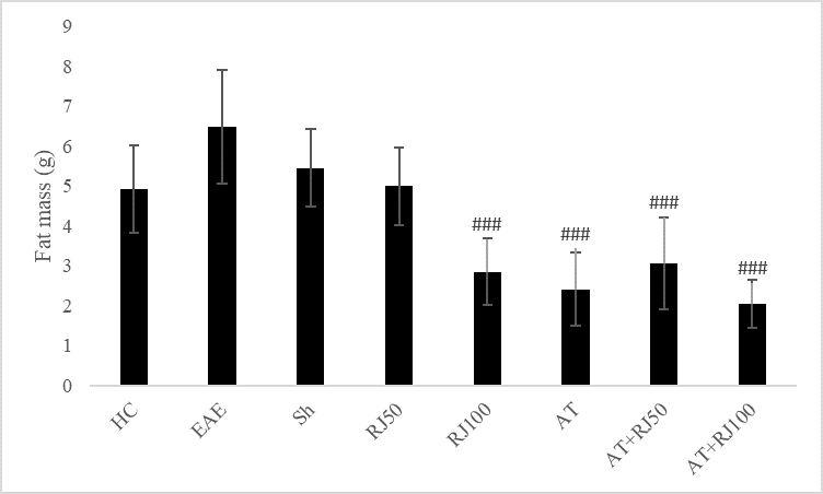 (18). Hence, reducing inflammatory factors and improving fat profile can also be the reasons for reducing fat mass and increasing aerobic power. However, at lower dosage and shorter duration, this may not occur due to insufficient biological effects. Therefore, it seems that in addition to the ability to inhibit inflammatory factors and reduce oxidative stress, RJ100 can activate other beneficial biological effects in patients with MS. However, the effect of royal jelly on caloric intake, muscle mass and body composition is still not well understood. The results showed that AT + RJ50 and AT + RJ100 decreased weight, visceral fat weight and increased aerobic power in EAE rats; AT + RJ100 also reduced food intake and BMI in EAE rats; in addition, the increase in aerobic power is training-dependent, so that it was higher in the AT, AT + RJ50 and AT + RJ100 groups than the RJ50 and RJ100 groups. Studies show that exercise by stimulating the synthesis of muscle proteins in striated muscle tissue, improves neuronal function, improves the metabolism of fats and sugars, improves physical function and reduces the risk of cardiovascular disease in patients with metabolic syndrome as well as patients with nervous system disorders