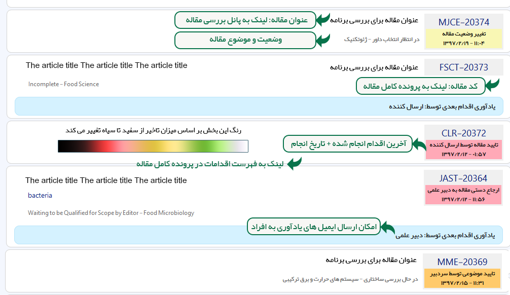 این سامانه به هر فرد تنها یک نام کاربری و رمز عبور اختصاص می دهد و با همان نام کاربری می تواند به همه نقش های خود در همه نشریات دسترسی داشته باشد. توضیحات هر بخش از این سامانه در تصاویر زیر ارایه شده است.نسخه اولیه این سامانه برای مقالات عرضه شده است. اما با داشتن امکان تغییر و تنظیم نقش ها و عناوین، امکان استفاده از آن برای بررسی هر نوع سندی وجود خواهد داشت.
